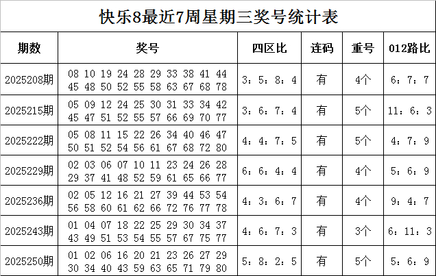 福彩快乐8第2025250期(上周三)奖号回顾:01 02 06 16 20 21 23 26 27 29 30 34 40 43 59 63 65 71 79 80,其中奖号四区比为5:8:2:5,012路比为5:6:9,包含5个重号01、29、30、34、43,包含连码01 02、20 21、26 27、29 30、79 80。