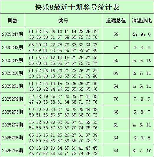 杨光快乐8第2025257期奖号冷温热分析(定义:遗漏0-1期号码为热码,遗漏2-4期号码为温码,遗漏4期以上号码为冷码)