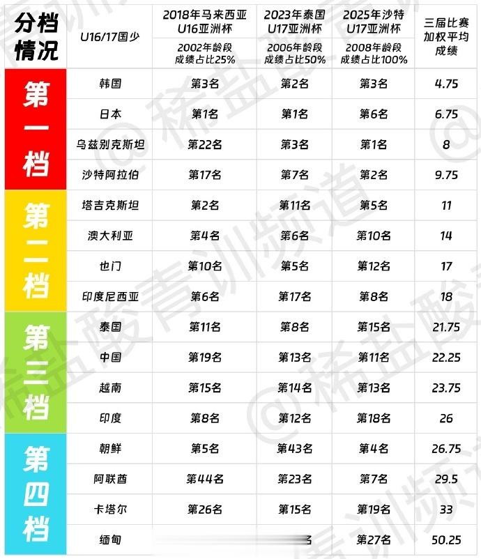 博主统计2026年U17亚洲杯分档详情: 韩日乌沙第一档, 中国第三档