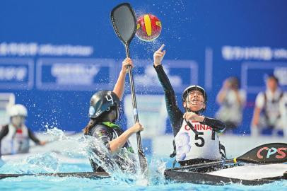 8月13日,成都世运会皮艇球项目在简阳文体中心游泳馆开赛。与伊朗队比赛中,17岁的巢语佳(右)为中国队打入世运会皮艇球历史的首枚进球。四川日报全媒体记者何海洋摄□四川日报全媒体记者陈宇