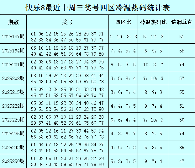 福彩快乐8第2025250期(上周三)开奖回顾:01 02 06 16 20 21 23 26 27 29 30 34 40 43 59 63 65 71 79 80,其中奖号四区比为5:8:2:5,冷温热码比为4:7:9。