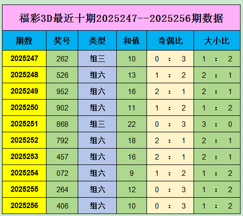 福彩3D上期开出奖号为406,奖号为组六形态,和值为10,奇偶比为0 : 3,大小比为1 : 2。