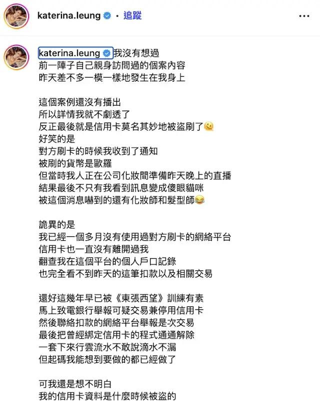梁菁琳在社交平台上发布了信用卡被盗用的信息截图,并写道:“对方刷卡的时候我收到了通知,被刷的货币是欧元,但当时我正在公司化妆间准备昨晚的直播。结果,不只是我看到信息后傻眼,化妆师和发型师也被这个消息吓了一跳。”