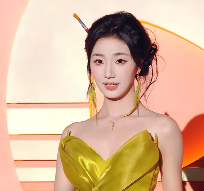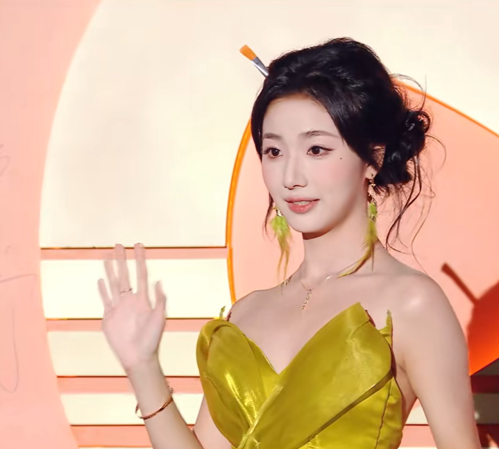 对比上次红毯,她的妆造进步了很多,她表现得也很大气,本来拿着画笔道具,到签名的时候没地方放,直接“唰”地一下插在了头发上。