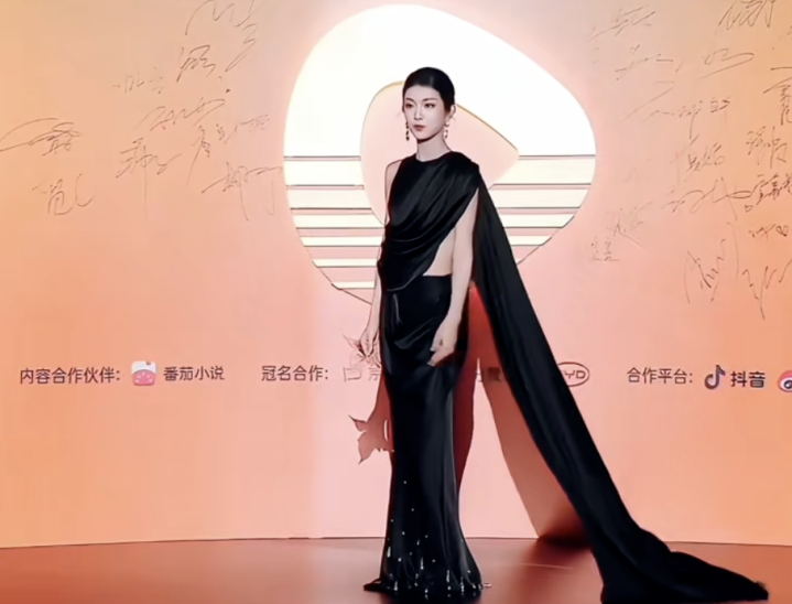 像卢鹿鹿,黑色带长披风的礼服不易撞衫,大高个的她与黑色礼服相得益彰,头发梳得一丝不苟,走路带风,御姐范儿十足吸睛。
