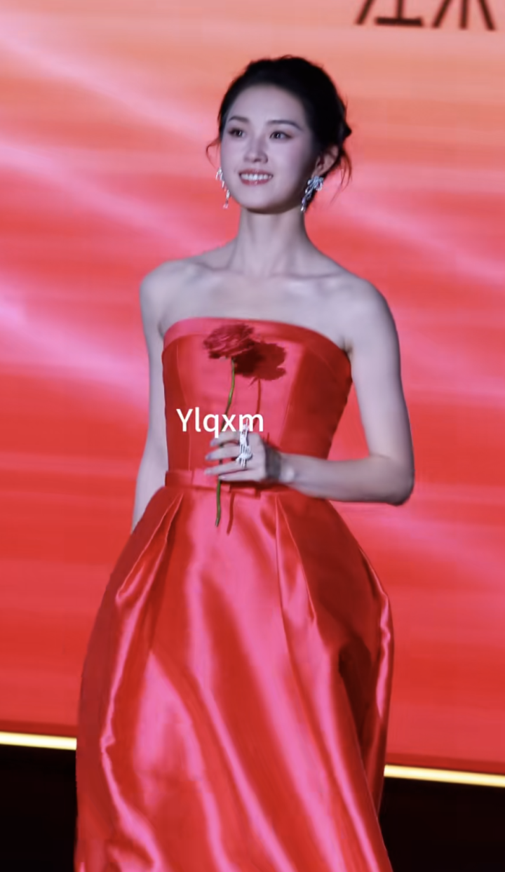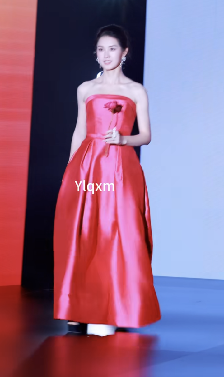 升咖的郭宇欣,一袭红色的抹胸裙,依旧是最突出她五官的盘发,但礼服有点丑,缎面质感,把她纤瘦的身材都撑大了一个号。