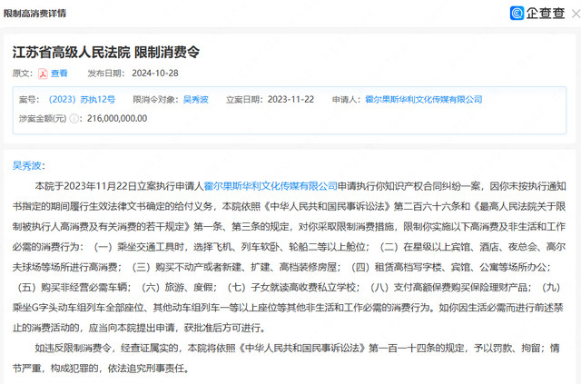 值得注意的是,目前,吴秀波仍关联有与霍尔果斯华利文化传媒有限公司知识产权合同纠纷一案,吴秀波因此案被限制高消费,并被列为失信被执行人,涉案金额2.16亿元。