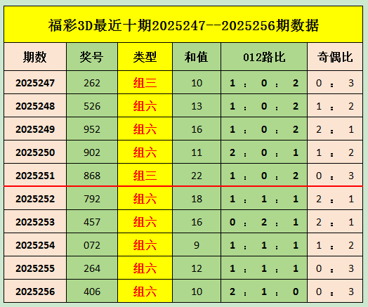 福彩3D上期开出奖号为406,奖号为组六形态,和值为10,012路比为2 : 1 : 0,奇偶比为0 : 3。