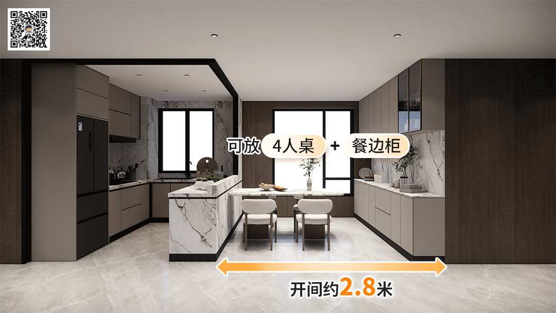 约4米大开间,在留足餐边柜和行走空间之后,还能从容地放下8人桌,解决了传统餐厅空间不足,大家族无法围桌用餐的痛点。