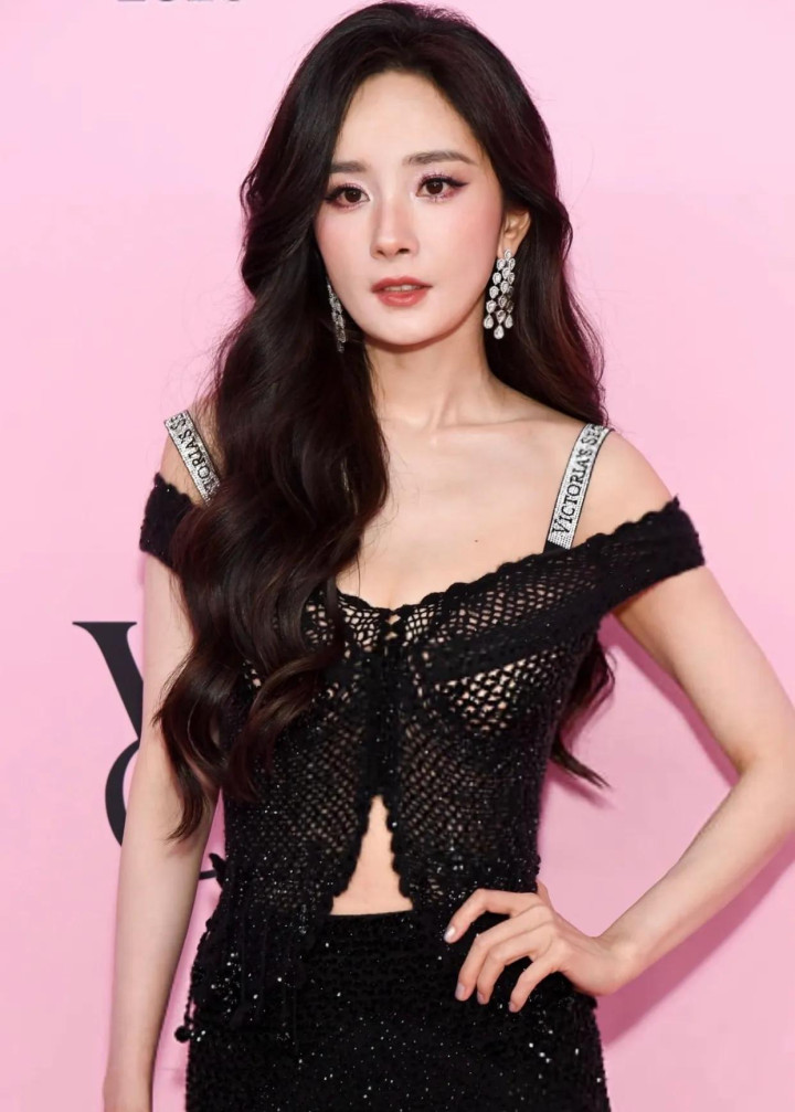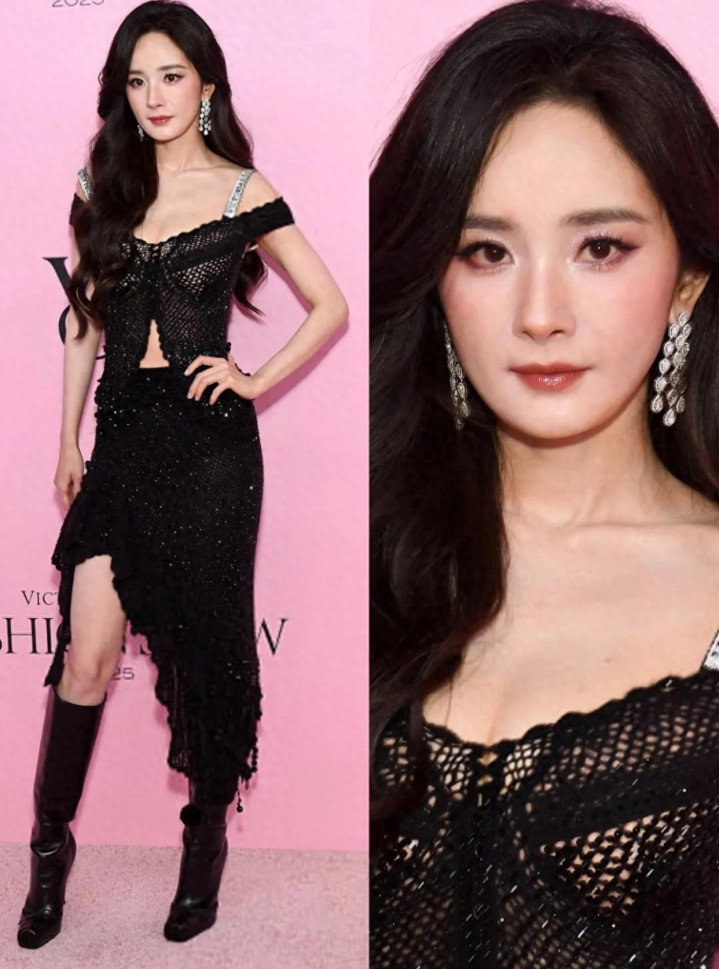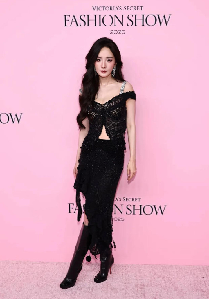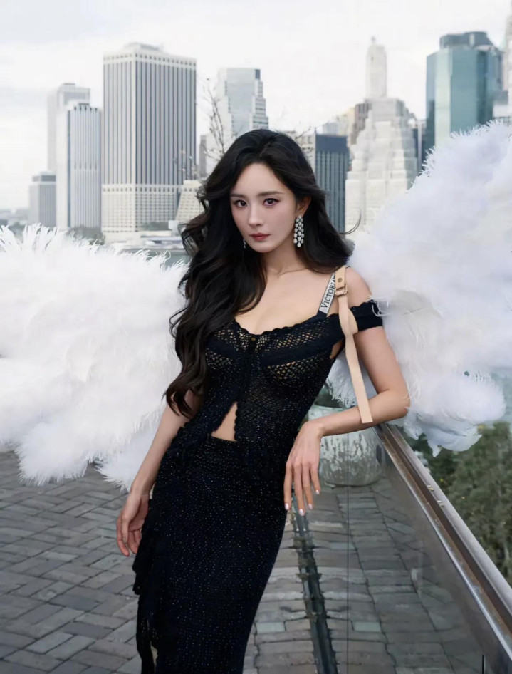杨幂穿黑色镂空蕾丝裙现身维密, 比模特还耀眼, 就差一对翅膀了